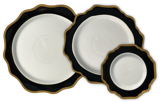 The Royal Flower Black Dinner Plate with Gold Rim brings a regal touch to your event. Its luxurious black design with a delicate gold rim is perfect for elegant dinners, weddings, and upscale celebrations.